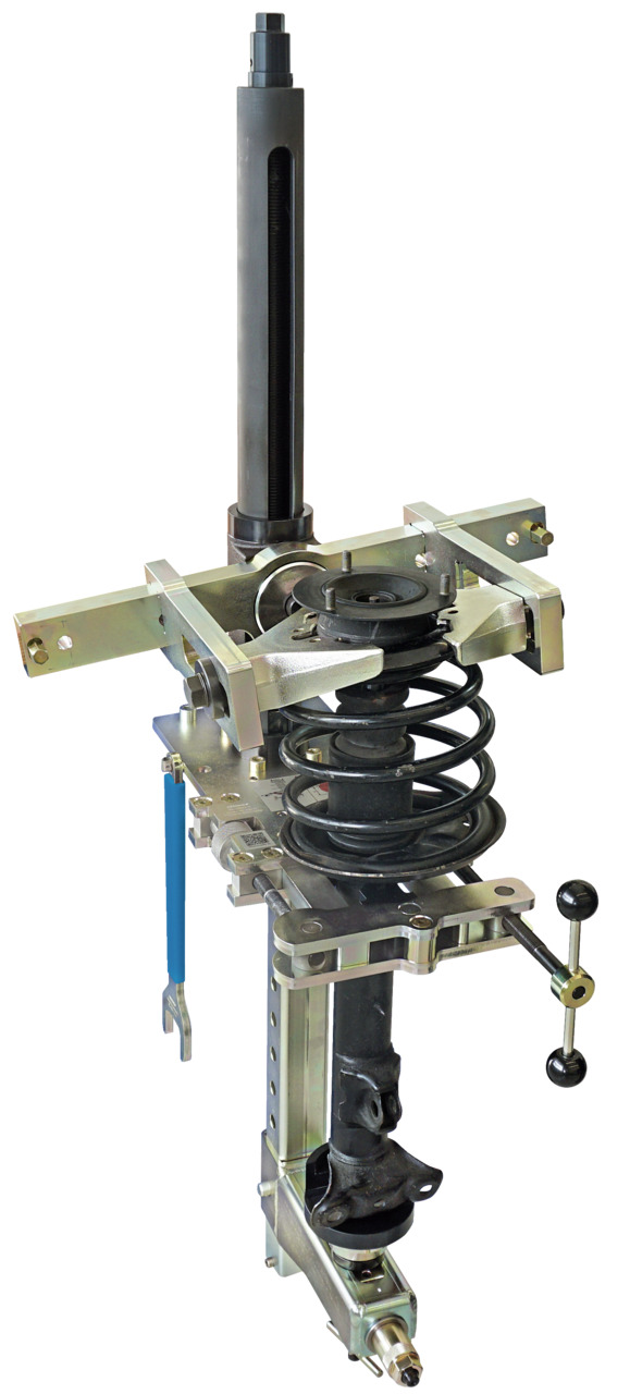 The Gedore stationary Spring Compressor is a universal fit for nearly all McPherson suspension struts on the market. Fits particularly for right or left rising springs, conical springs, eccentric springs, springs with a low number of coils, springs with a high or varying spring pitch, spring struts with tension stop springs as well as for spring struts with electronic control and sensors.